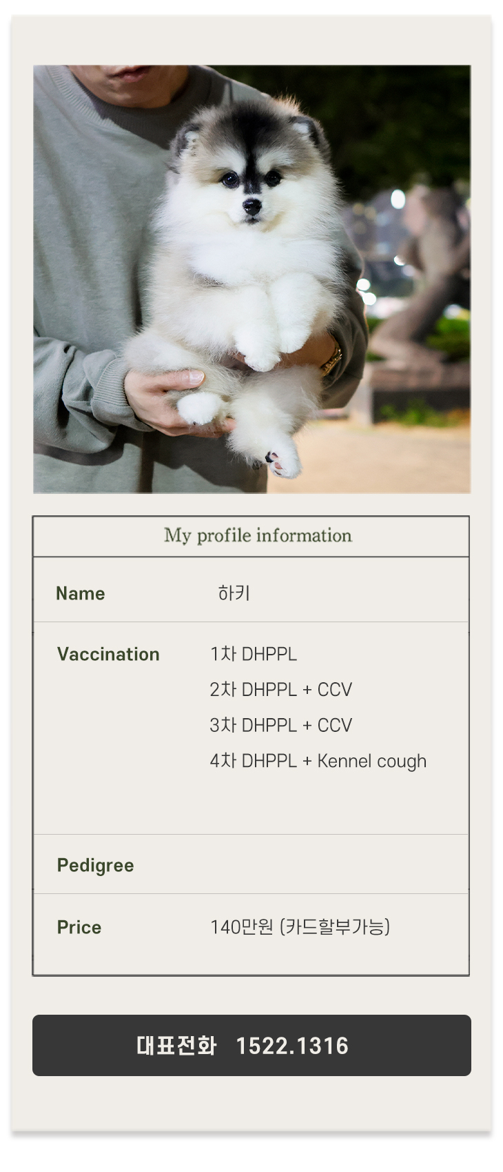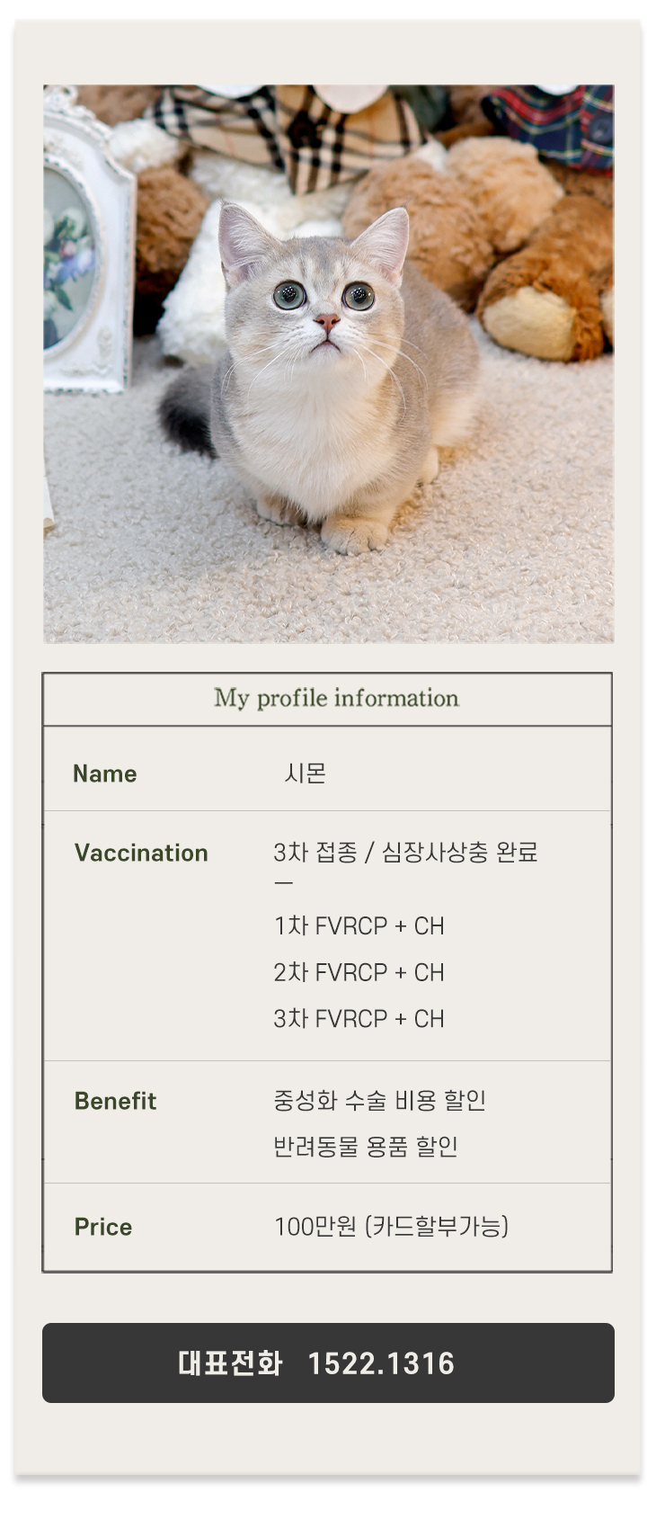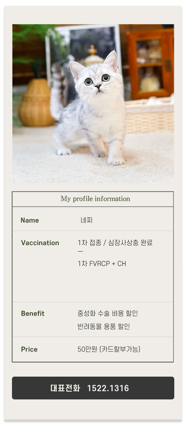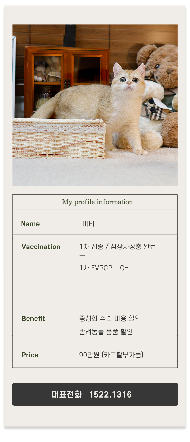 현 애완동물 피해보상 규정인 15일 아닌 1년(365일)동안 자견, 자묘의 건강을 연장 책임보장 하며, 질병발생시 병원에서 입원치료, 폐사시 업계최초로 동종교한 또는 환불을 보장합니다.