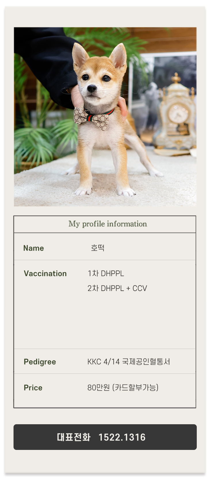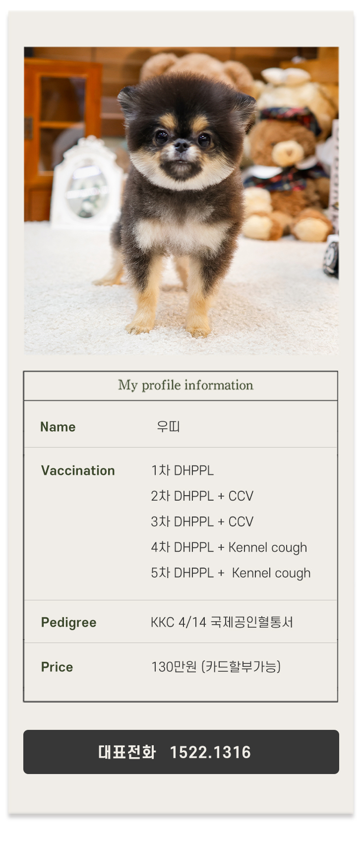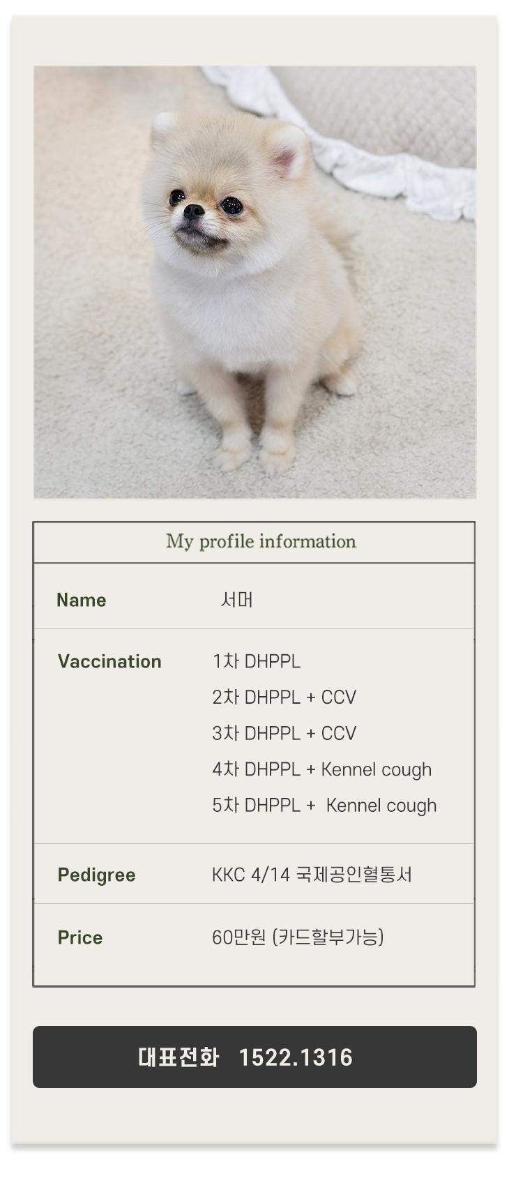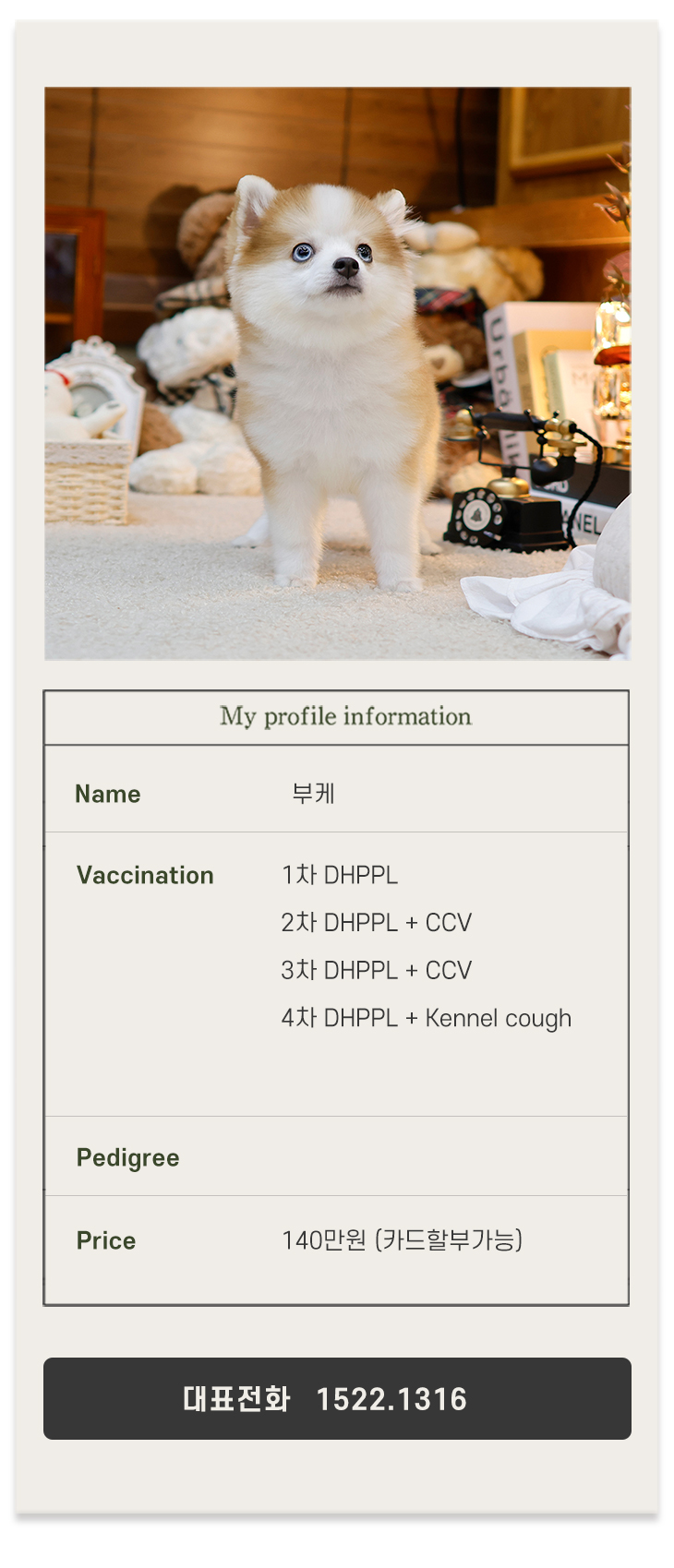 현 애완동물 피해보상 규정인 15일 아닌 1년(365일)동안 자견, 자묘의 건강을 연장 책임보장 하며, 질병발생시 병원에서 입원치료, 폐사시 업계최초로 동종교한 또는 환불을 보장합니다.